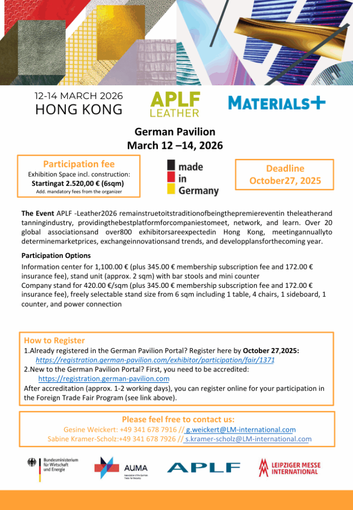 We are delighted to invite you to exhibit at APLF and Materials+ 2026 (12-14 March 2026), in partnership with the esteemed German Pavilion. Last year, 13 German suppliers participated and successfully met with international VIP buyers. Click here to see the Post Show Report 2025. We look forward to your participation!